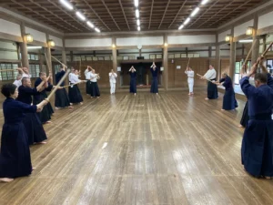 Step out with your left foot into a “horseback” stance with your feet a little more than hip-width apart and parallel in front. The Feet do not move during the exercise. The knees are not fully extended, but a little bent. You raise the sword high above your head to swing. The inclination of the sword one can vary, but one should mainly use an angle of 45 degree overhead and to the rear. Arms and shoulders should definitely remain relaxed. Then you swing the sword straight down while springing loosely in both knees. The sword stops in front of the stomach in a horizontal position. One should take care that hands do not arrive below the sword tip (kissaki), but you should move kissaki down in a large circular motion so that the kissaki and hands arrive at the level of the abdomen at the same time, where the striking movement ends. The ki should are mainly placed on the kissaki. You can practice this exercise with an object like an old tire or a stuffed sack in front of you (to check your strike for effectiveness).