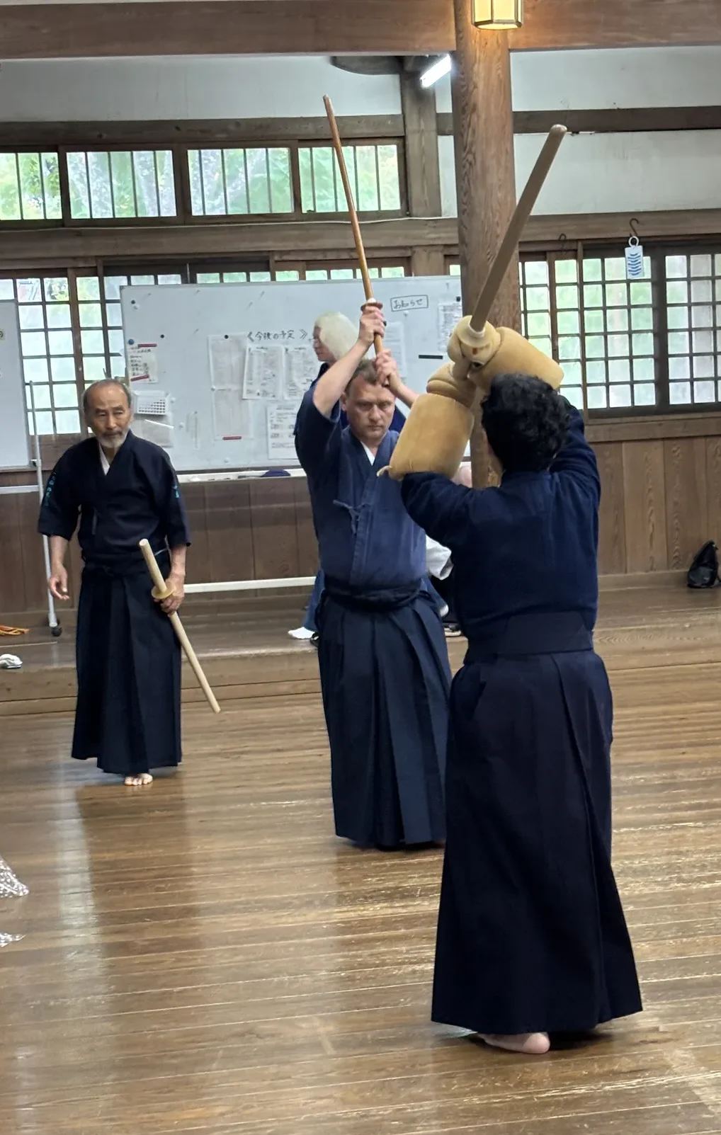 As in the Kiriotoshi exercise, U first strikes S’s shomen directly with his left front foot (without stopping or moving to the right as in Ippon-me), but he raises his left knee high as in Ippon-me. S performs Kiriotoshi until U’s mizo’ochi. After that, they separate again. After that, they return to the center, and U strikes S’s shomen with his right front foot, also with his (right) knee raised. S performs Kiriotoshi up to the neck, steps forward with a left-right step (Seme-age), and strikes U’s migi-gote, after U steps back starting with the back (left) foot and changes to Jodan. Then S moves to Zanshin Gedan. After that, Gedan-awase.